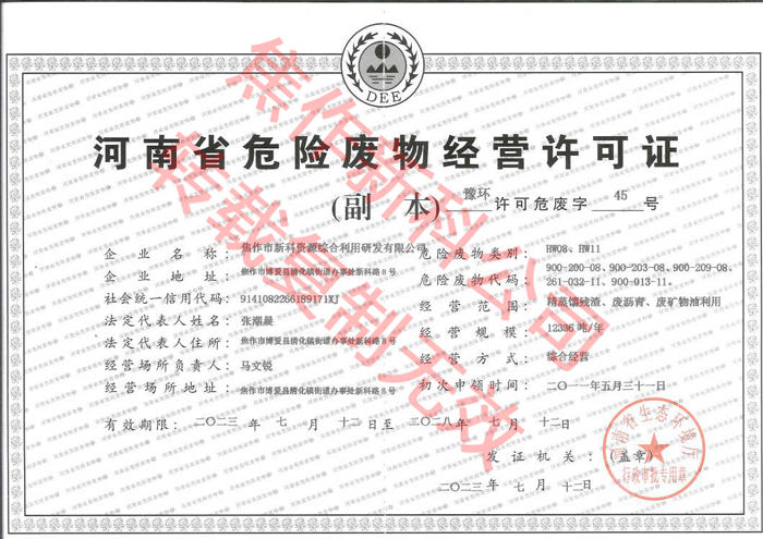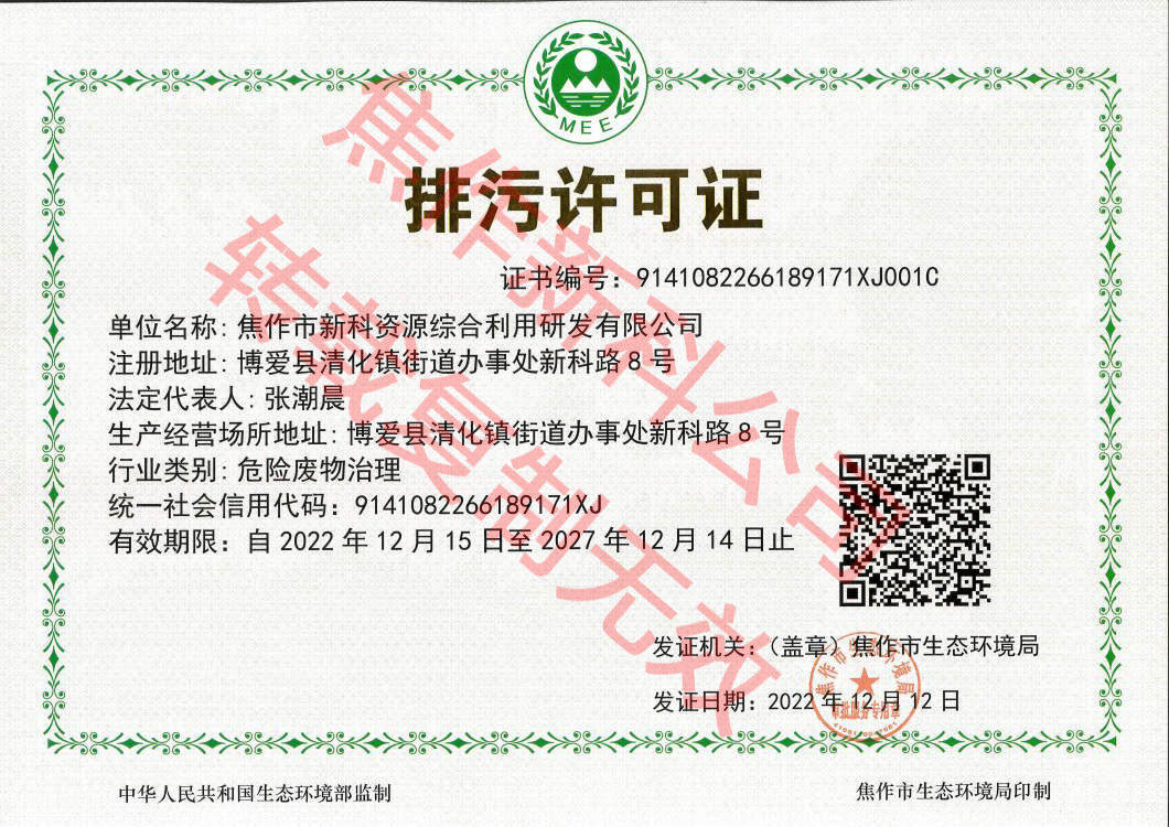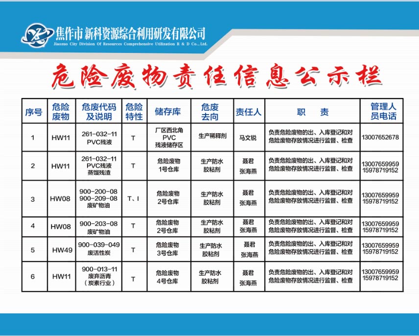焦作市新科資源綜合利用研發(fā)有限公司位于博愛(ài)縣新科路8號(hào),占地40余畝,注冊(cè)資本3000萬(wàn)元,是一家科技環(huán)保型危險(xiǎn)廢物綜合利用企業(yè)。目前擁有“年12000噸PVC殘液綜合利用項(xiàng)目”和“利用多種有機(jī)蒸餾殘?jiān)a(chǎn)防水膠黏劑項(xiàng)目”。